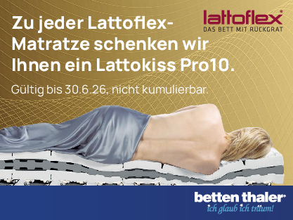 Die Qualität des Schlafs hängt auch von der passenden Schlafunterlage ab. Hier kommt die wohl grösste Innovation der Bettenbranche ins Spiel: das Lattoflex-Schlafsystem "mit Flügeln". Bis zum 23. April findet bei Betten Thaler die Lattoflex-Tiefschlaf-Aktion mit Rückgaberecht statt. Termine sind buchbar unter 041 240 86 46.